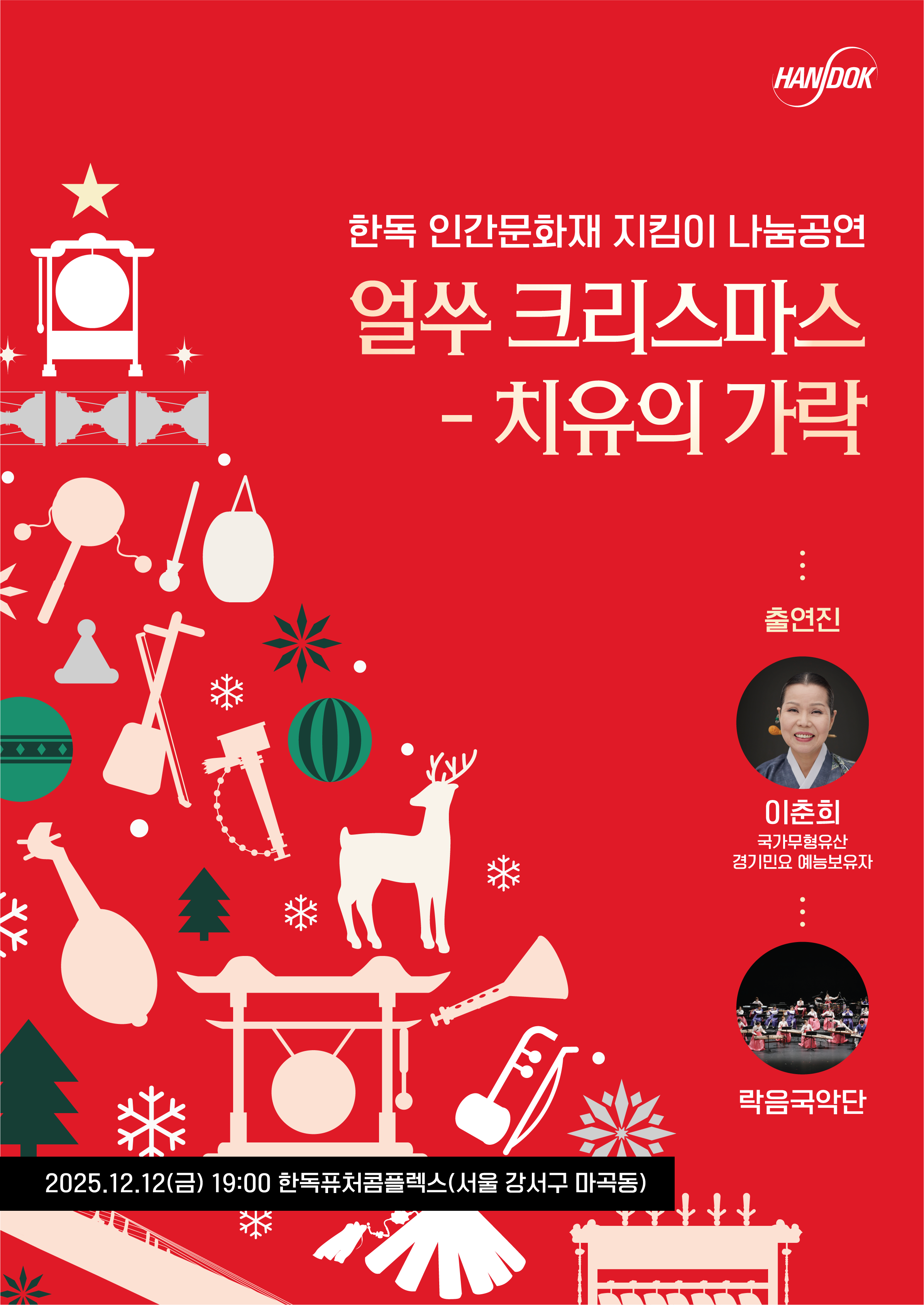 한독(대표이사 김영진, 백진기)이 오는 12월 12일(금) 오후 7시, 서울 마곡에 위치한 한독퓨처콤플렉스 이노베이션홀에서 인간문화재 지킴이 나눔공연 '얼쑤 크리스마스-치유의 가락'을 개최한다. 이번 공연은 사전 신청을 통해 무료로 관람할 수 있다.