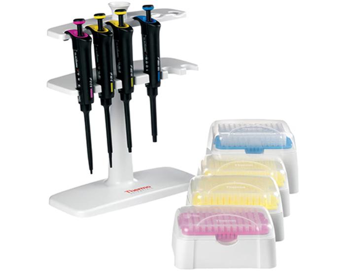 A complete set including Finnpipette™ F1 pipettes in various volumes, compatible Finntips, and a pipette stand.